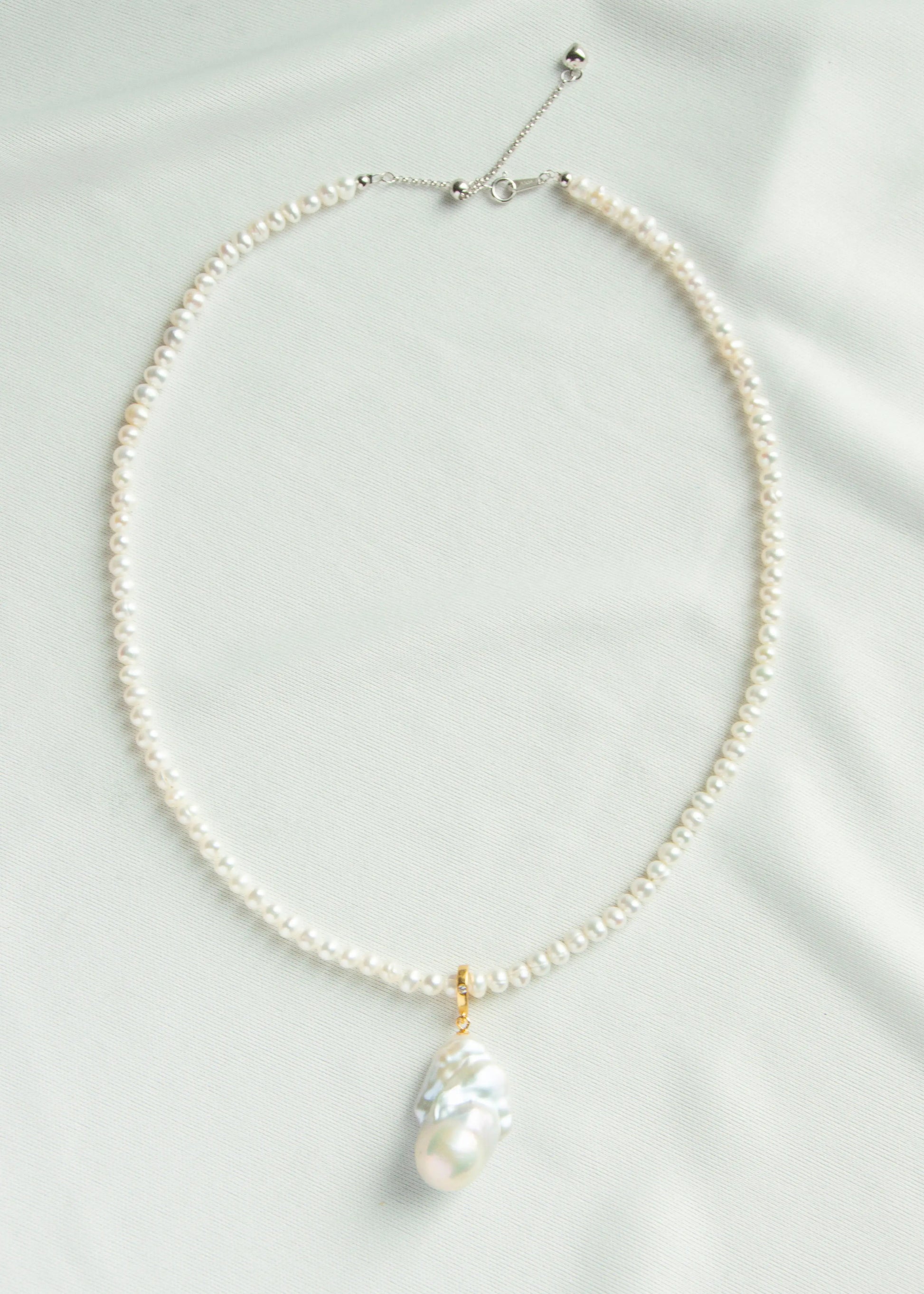 Barockpärlor symboliserar skönhet i ofullkomlighet, likt drömmar som växer långsamt men säkert. Den förgyllda silverkedjan representerar ditt löfte till dig själv: "Det du vårdar kommer att blomstra."